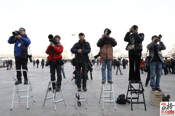 3月2日,政协预备会议,摄影记者站在梯子上拍摄。